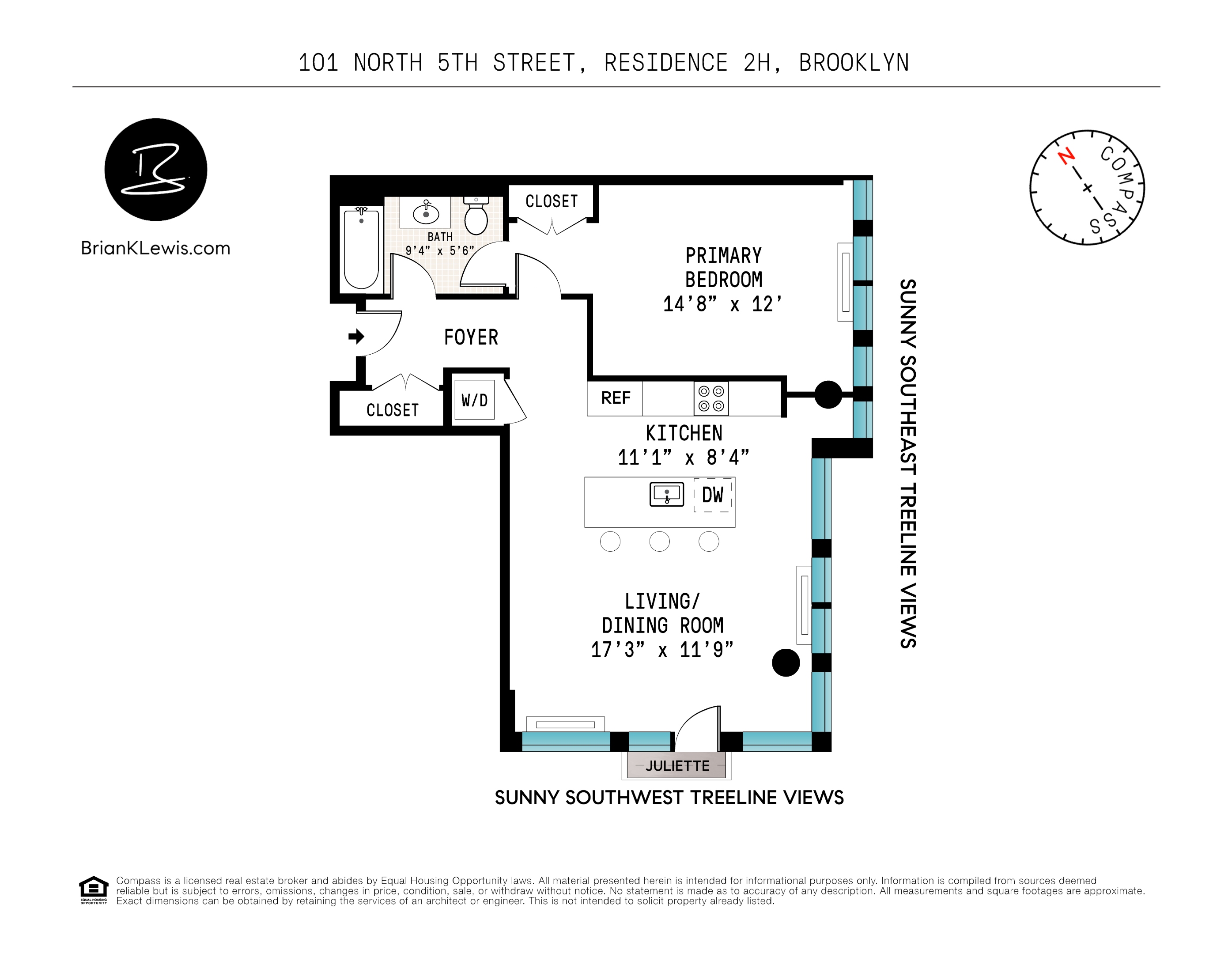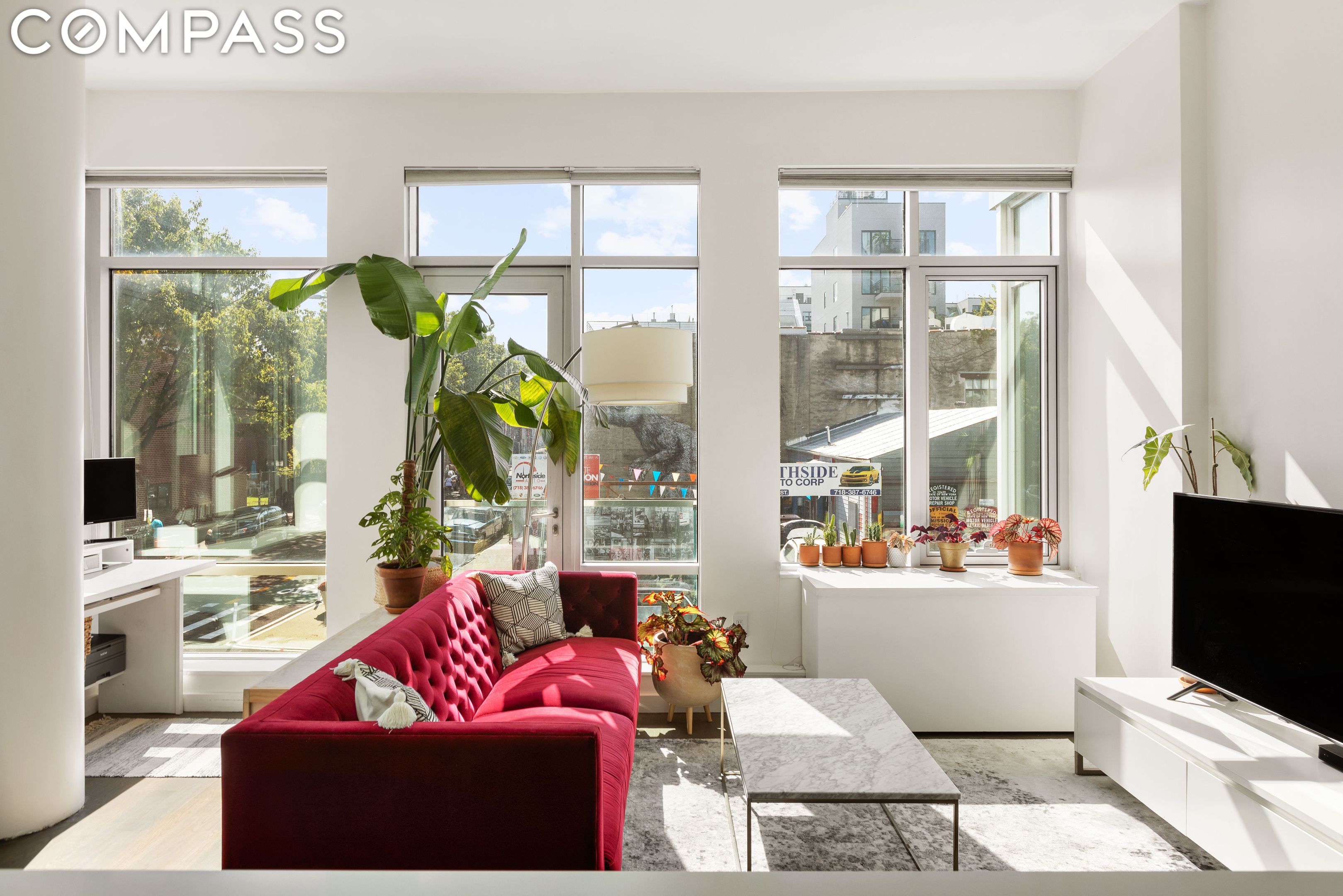 FRESH PERSPECTIVE: LIGHT-FILLED, LUXE & LOVELY, HIGH-CEILINGED, SPARKLING SOUTH-FACER COVETED CORNER CONDO w/FEEL-GOOD FLOOR-TO-CEILING WINDOWS & JULIETTE BALCONY ON THE TREE-LINE PERFECTLY POSITIONED IN PRIME WILLIAMSBURG BOUTIQUE BUILDING w/GYM, GARDEN, LOUNGE, GARAGE & SKYLINE-VIEW ROOF DECK Here's a surprisingly stupendous space that gives you a residential trifecta: beautiful light, a dynamic view, and an enviable location -- with luxurious touches all around you. Bright, alive, and convenient, life here is peaceful, vibrant, and fun. All around you are the stimulating destinations of your wonderful North Williamsburg neighborhood -- yet here, you are nicely nested and thriving in the comforts of your well-cared-for, happy home. Above you, ceilings soar to nearly 11-feet, underfoot are freshly redone 4"-wide Oak planks, and everywhere you look there are exciting views and artful light. The dramatically scaled living/dining room is an expansive, corner, open-plan stunner boasting walls of windows 9-feet tall. With a Juliette balcony and room for an office area, this space shines brightly -- with tree-line views and a surprisingly sun-filled relationship with its dynamic surroundings. The over-scaled dining bar onto its handsome designer kitchen makes this lofty living/dining/kitchen area an entertainer's dream. Well planned and well appointed, the smartly designed kitchen offers an attractive practicality. With a suite of appliances by Bosch and FCI, fixtures by Dornbracht, and ample Ceasarstone counters and Veneta Cucine cabinets, this big kitchen is ready for all of your culinary adventures. A grand intimacy permeates this easy-to-love and easy-to-live residence. The king-sized bedroom features more of this home's terrific tree-line views, and offers good designer closet space. With en-suite and hall access to its dual-entry bath -- with soaking tub and fixtures by Porcher, and Grohe -- this suite is a well appointed retreat. An elegant foyer separates the bedroom area from the living space, the built-out closets are plentiful, and a washer/dryer rounds out the specialness of this home. With a prime perch in its treasured building, this condo enjoys all of the perks of its well-appointed address and neighborhood. Here, at 101 NV, residents are served by a virtual doorman, a secure package room, a full fitness center, renovated media lounge, bike storage, a garage, a 2,000 square foot courtyard garden, and a dramatic common roof deck that spans the entire building -- offering striking views of the iconic Manhattan skyline and the Williamsburg Bridge. Located in the center of North Williamsburg, NV is a block from the Bedford L stop, 3 blocks from the East River Ferry and pier, and is 1 block North of Whole Foods, NYSC, the Apple store and Trader Joe's. Most every area art, cultural, dining, shopping, entertainment, and fitness destination is a stone's throw from home -- not to mention close proximity to Domino Park, McCarren Park and East River State Park/Bushwick Inlet Park. Surprising, soulful, and sun-filled, here is a special opportunity for residential bliss. Welcome to a fresh perspective on Williamsburg.
