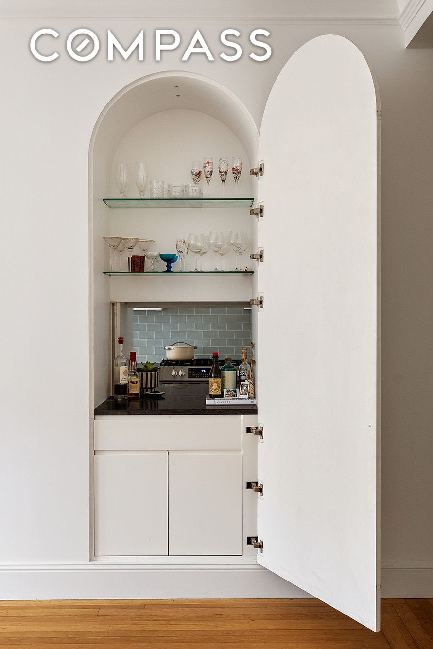 Through the beautiful Astor Court lobby -- overlooking the famed building's signature courtyard garden -- up the attractive elevator and onto the coveted building's boutique eighth floor hallway, you enter an ideally perched, rare home. Inviting you in is a large gallery foyer that guides you to the well-scaled living room. Here is your West-facing, sun-filled entertaining space with two over-sized windows with architectural and sky views, a wall of dramatic, custom-milled built-ins, a smokeless fireplace, and a secret bar.