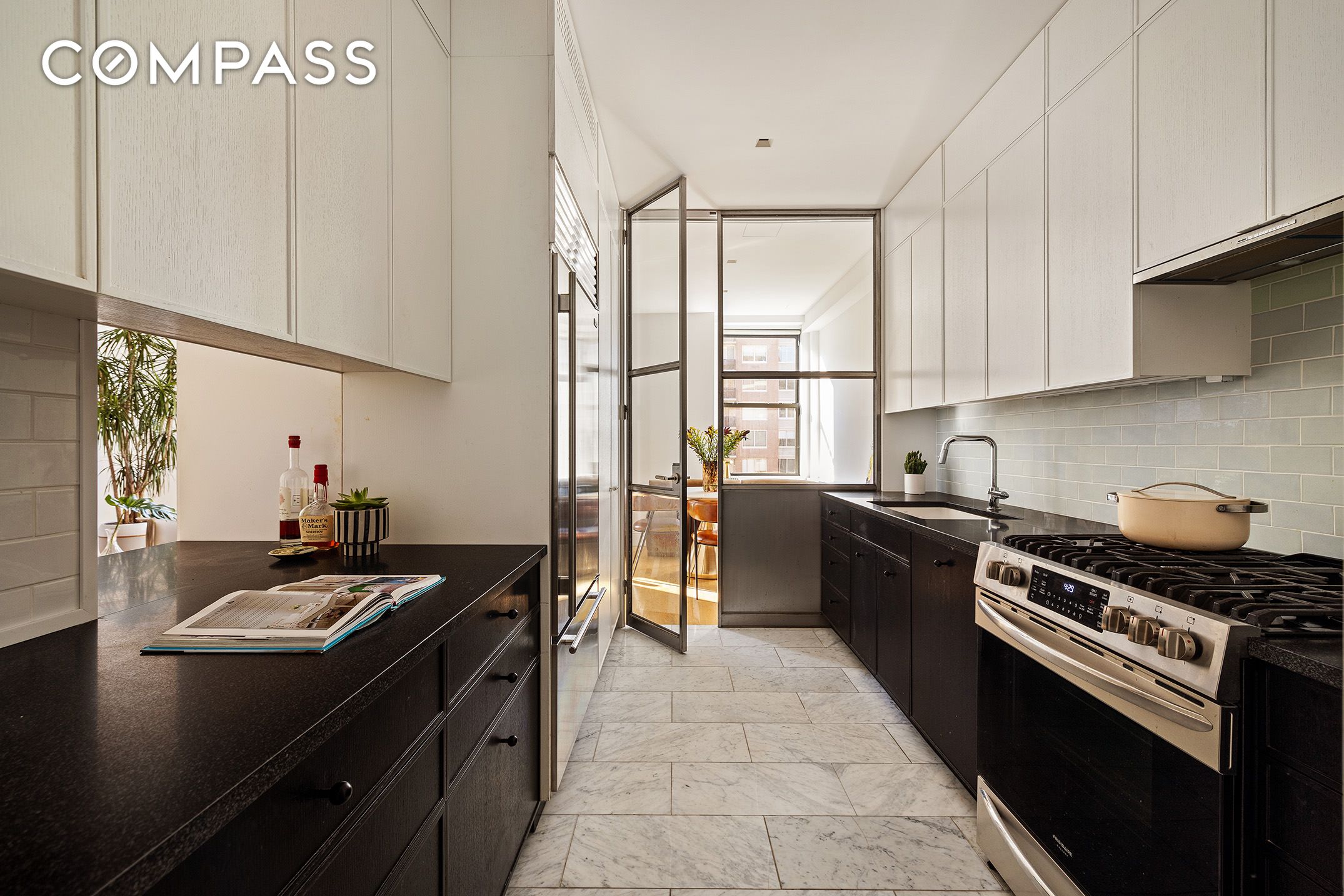 Handsome and practical, the large kitchen offers honed granite counters, ample custom cabinetry, a stainless SubZero fridge, five-burner Miele stove, handmade tile backsplash, and features custom, polished steel and glass doors that lead to the versatile dining area.