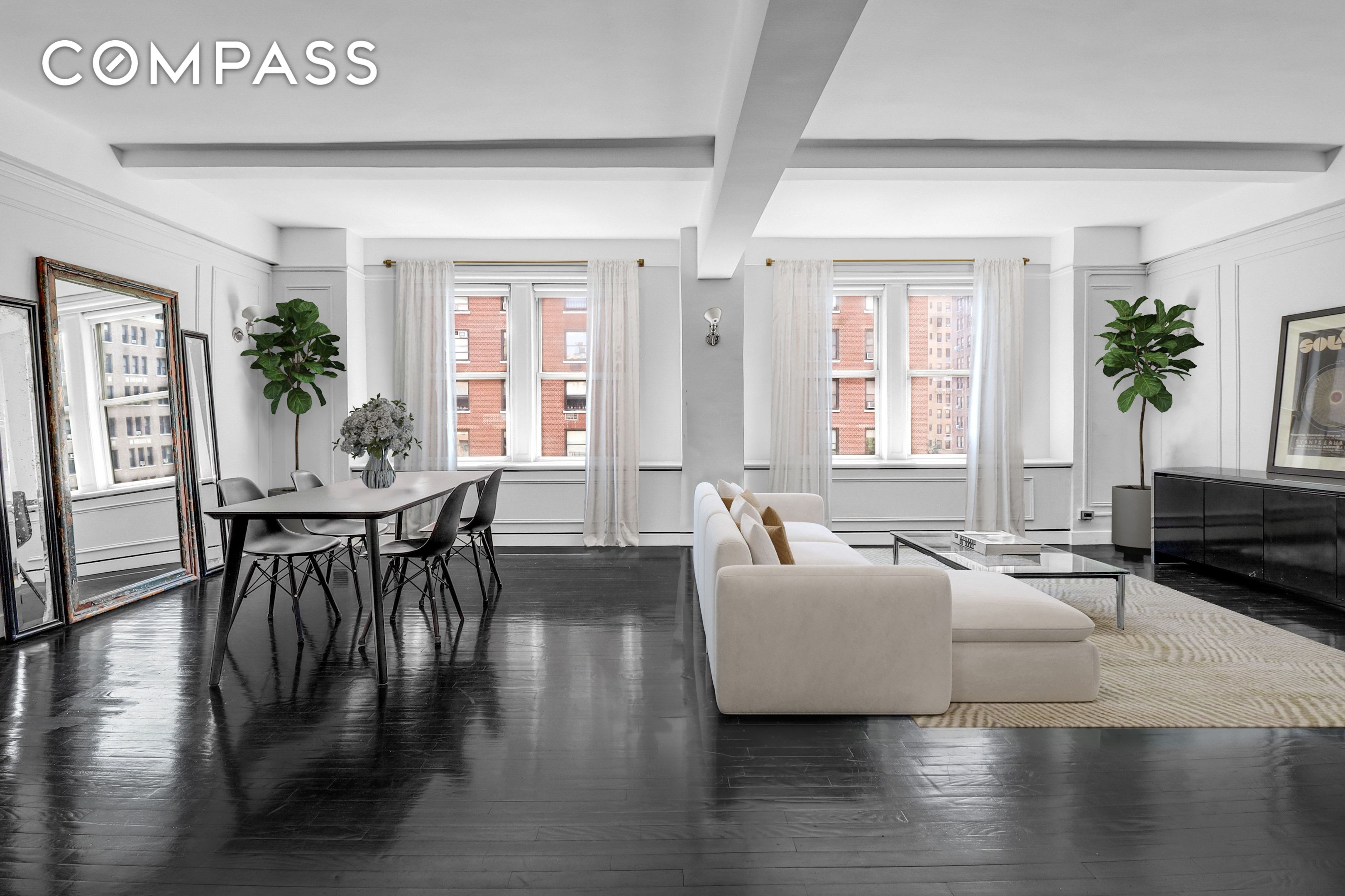 Flooded with natural light, this nearly 40-foot-wide south-facing loft boasts a wall of windows that bathes the entire space in sunlight and frames delightful cityscape views. Every room--including the kitchen, baths, living room, bedrooms, and office--boasts its own window, flooding the space with natural light and creating an open, airy atmosphere throughout. Pre-war architectural details, such as soaring ceilings, refinished hardwood floors and original wall moldings add timeless charm to this contemporary home.