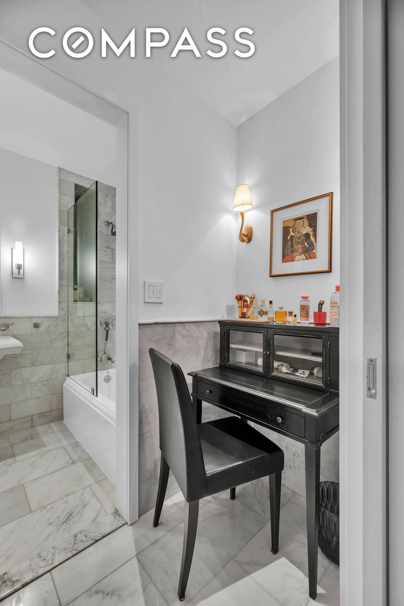 The entry hall brings you to a flexible bonus den -- an extra study, media, or guest space that offers one of two entries onto the terraced garden. The hall continues and unfolds into the dramatic corner living/dining room -- a sizable entertaining space with new casement windows onto the trees, and its own door onto the terrace. Dine inside by the fireplace, or al fresco under the leafy trees. Served by a spacious, eat-in, upgraded, windowed, cook's kitchen (with top shelf appliances by Subzero, Viking, and Wolf -- with wine fridge), life here is scrumptious. The king sized bedroom is peacefully perched on the tree-line, enjoys more of those new casement windows, has room for a sitting area, and is served by an impressively outfitted, jumbo walk-in closet. A thoughtful dressing area serves as a pass through hall, and leads to the marvelous marble bath. With top shelf fixtures, the luxe windowed bath is tasteful and terrific. There is central AC, a private laundry room, an audio system, immense storage, and ample room for art, books, and collectibles. Move-in ready, this mindfully curated home is a residential standout.