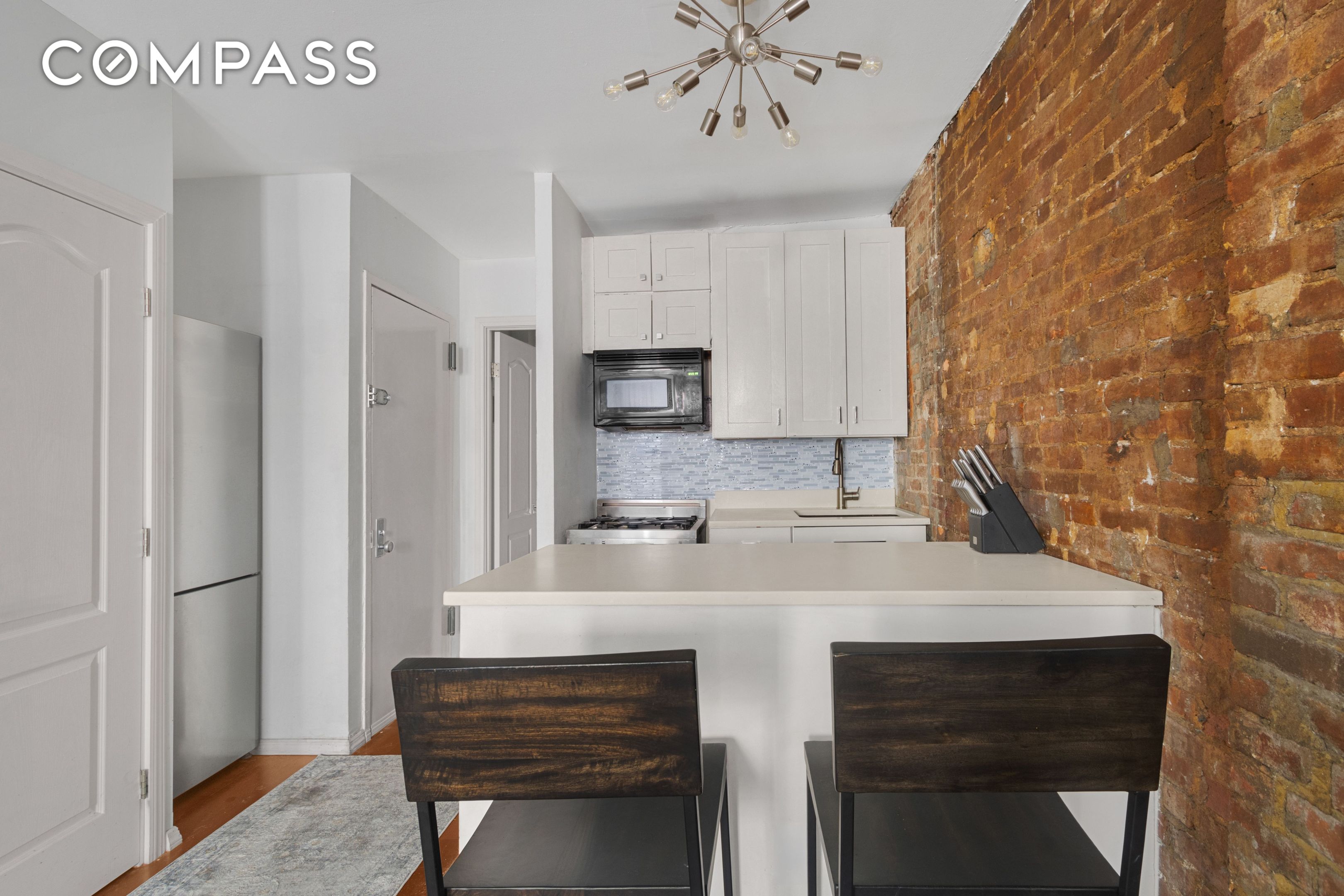 The renovated kitchen is open with a dining bar and stainless appliances -- even a small wine fridge. There is a wall of exposed brick, a decorative fireplace, wood floors, nice closet space, and a redone bath. There is room to lounge and entertain, and a sleeping area. The feeling here is good -- creative and calm -- a place to exhale and recharge.